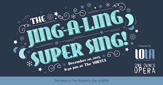 Our annual nightcap is almost here! Join us for a festive and fun-filled evening as One Ounce Opera and LOLA bring their Jing-a-ling Super Sing to The VORTEX & Butterfly Bar on Saturday, December 20th.