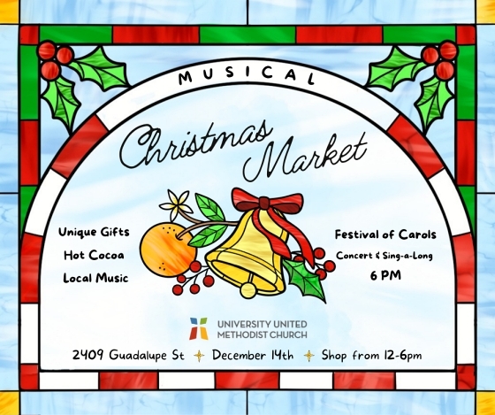 At 6 PM, head to our Sanctuary for a Festival of Carols: sing-a-long to your favorite carols and enjoy beautiful choral music by the combined choirs of University UMC, University Christian Church, and Trinity Church of Austin. These affirming churches share missions of love, inclusion, and justice. If you are longing for a time of candlelit communal singing this space of restorative, joyful, nostalgic music making is for YOU!